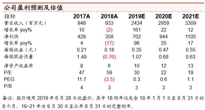 投资建议:并购重庆优质独立学院,旗下学校将增至 9 所,高教龙头地位进一 步巩固。给予 2019/20/21 财 年 净利润 7.02/9.44/11.05 亿元, EPS0.35/0.47/0.55 元人民币或 0.41/0.55/0.64 港元的盈利预测,当前股价对 应估值 30x/22x/19x,维持“买入”评级。