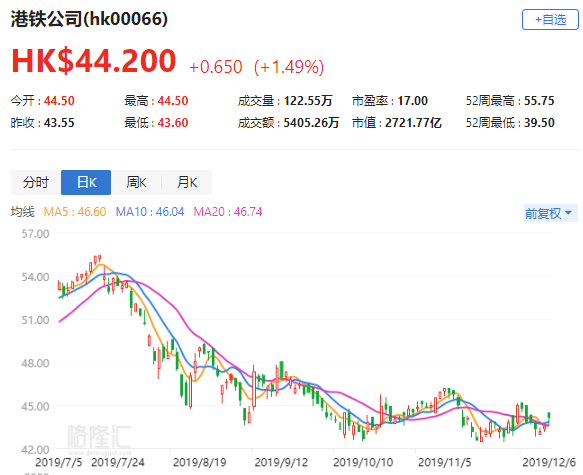 高盛相信公告可助缓解市场对公司盈利表现的忧虑,以及近期社会事件对公司未来派息比率方面的影响,由於现时仍未知社会事件会否持续,该行的现金流分析指出公司有足够的可持续现金流以支持渐进派息政策,随着未来数月香港社会有所稳定,其铁路业务亦快速复苏,而其车站及租赁物业业务更多是由本地市场主导,不受访港旅客趋势影响,未来将维持审慎。目前股价较资产净值折让16%,较历史平均值低一个标准差,重申“买入”评级,目标价54港元。