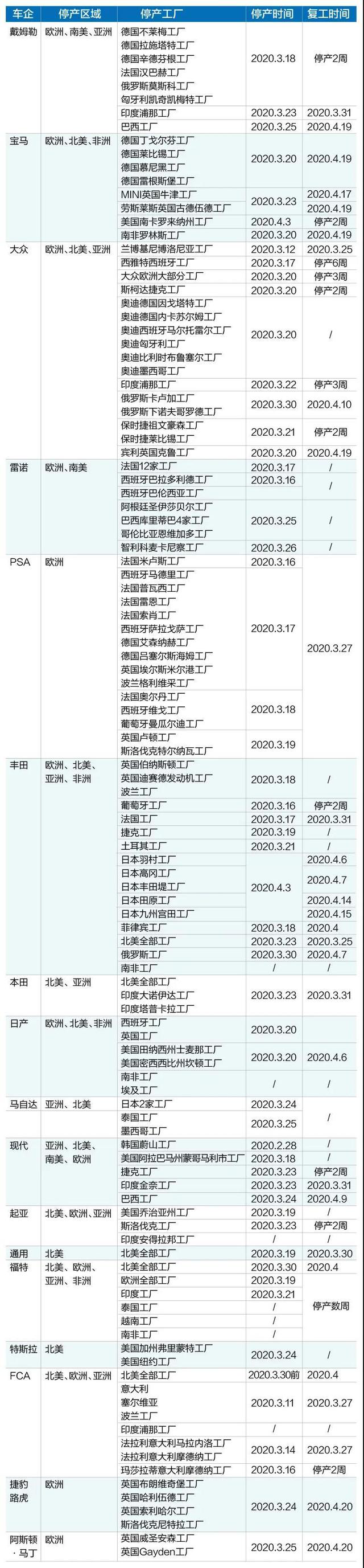 粗略统计,目前全球范围内已经停产和即将停产的整车厂总数已超过120家。其中,欧洲占据70席,包括大众、戴姆勒、宝马集团、雷诺集团、捷豹路虎、丰田汽车、日产汽车、保时捷、宾利、劳斯莱斯等汽车巨头均遭受强烈冲击。
