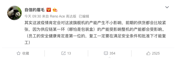 3月中旬,“自信的眉毛”(OPPO副总裁沈义人)发了一条微博,说哪怕供应链中的包装盒产能跟不上,也将影响整体的产能,直言疫情对于手机产业链的影响。
