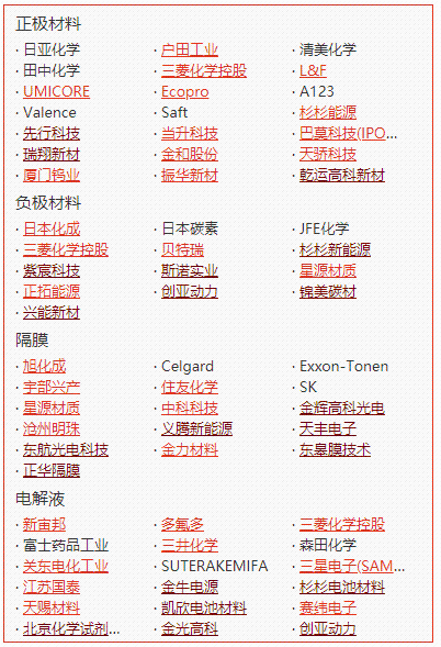第三,电池分正极材料、负极材料、隔膜、电解液,同样涉及到众多海内外供应商。