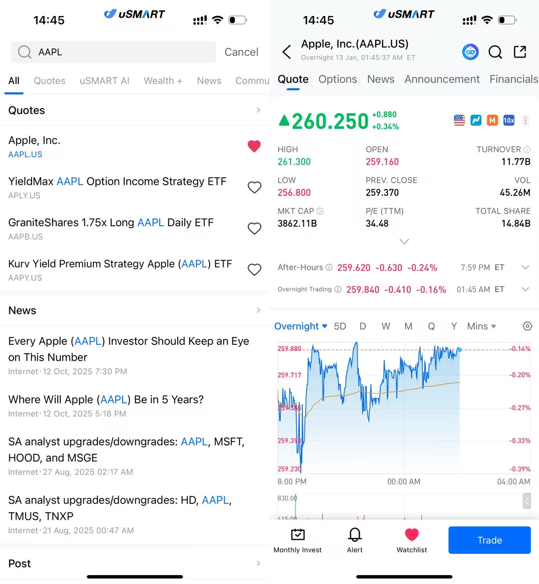After logging into the uSMART HK app, click the “Search” button in the top-right corner of the page, enter the ticker code (AAPL.US / GOOG.US), and navigate to the details page to view transaction details and historical trends. Click the “Trade” button in the bottom-right corner, select the trade type, and submit your order after filling in the transaction conditions.