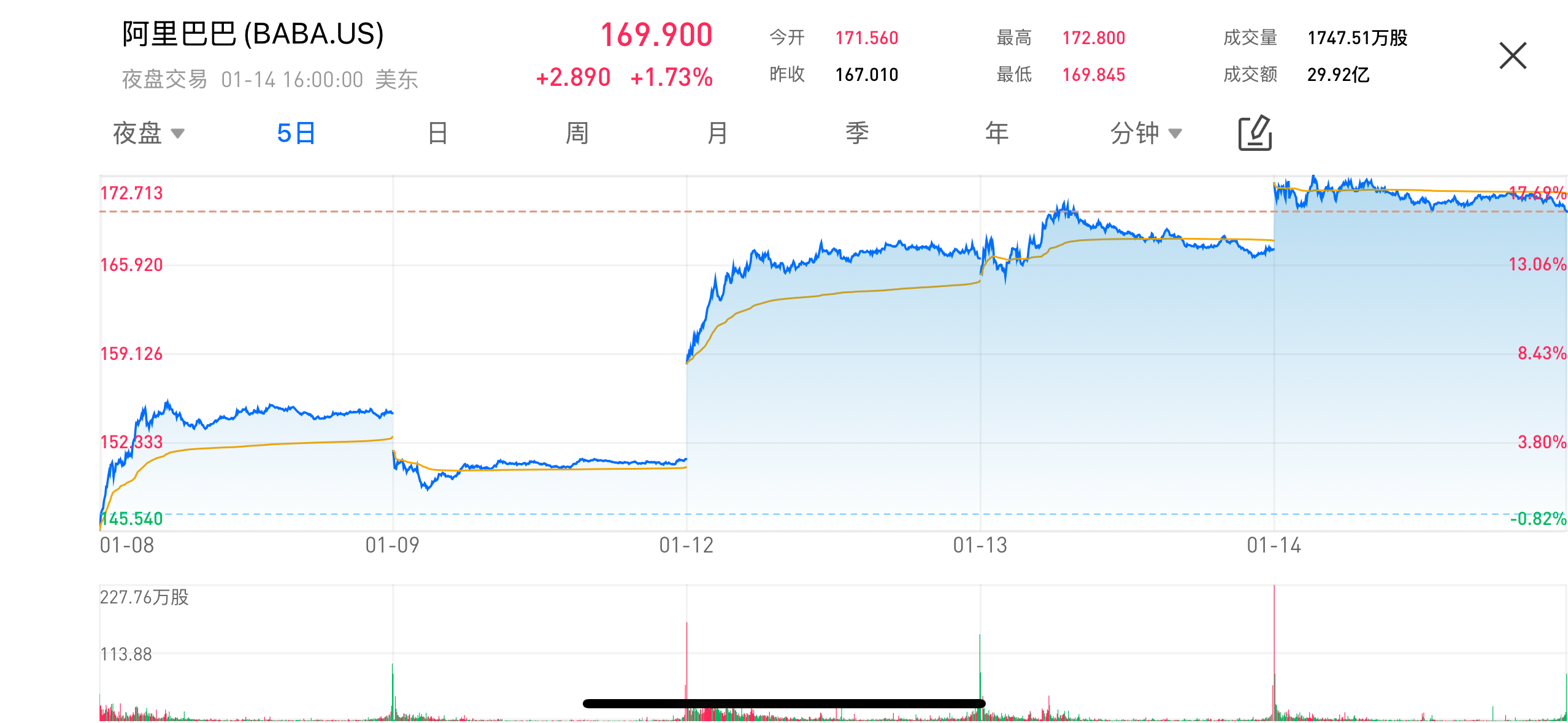 On January 14, Eastern Time, Alibaba's (BABA.US) stock continued its strong performance, closing at $169.90, up 1.73%, and reaching a peak of $172.80 during intraday trading. In recent trading sessions, Alibaba's stock has steadily risen, with a noticeable increase in market activity, as investor attention intensifies on its progress in AI commercialization.