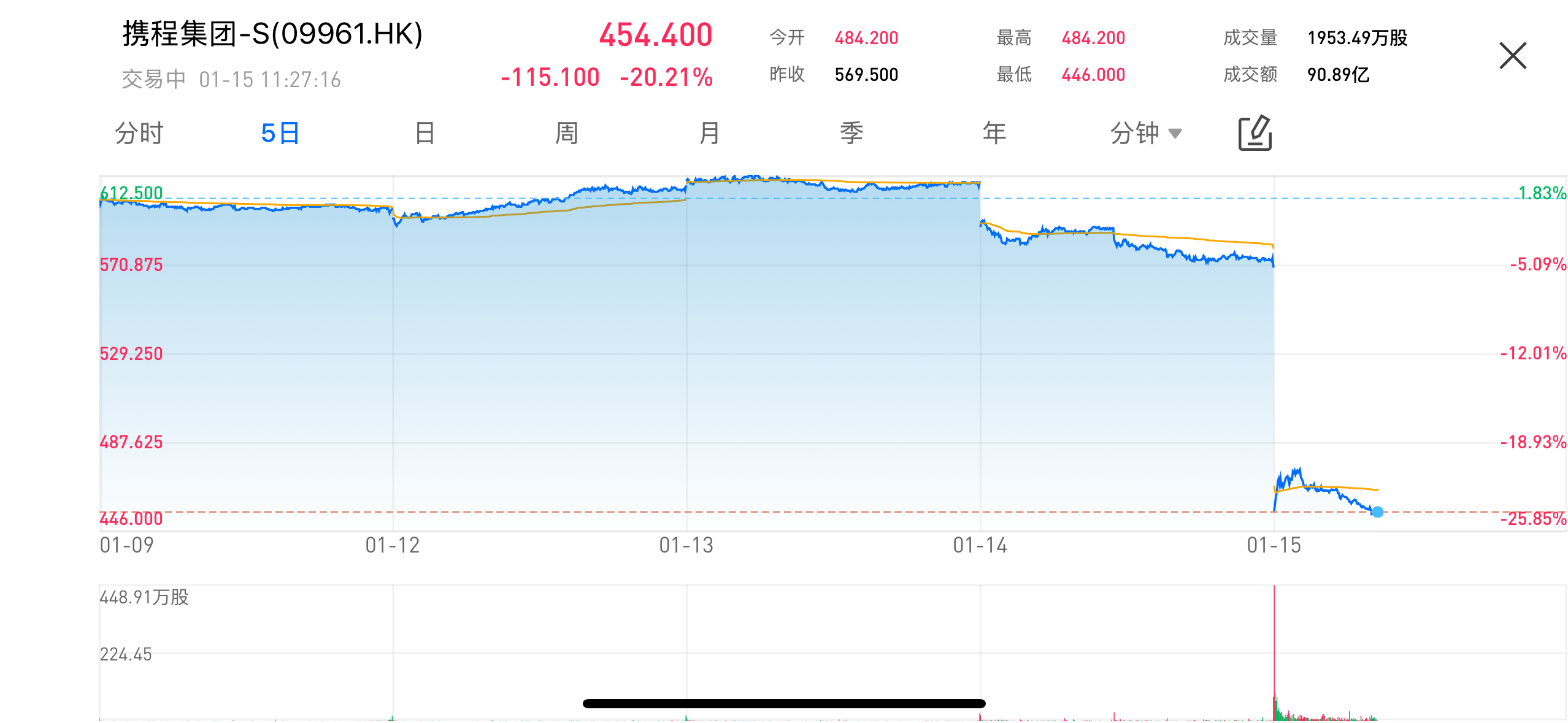 January 15, 2026 — Shares of Trip.com Group-S (09961.HK) suffered a sharp intraday sell-off on Thursday. During the trading session, the stock plunged more than 20%, last trading at around HK$454, after hitting an intraday low of HK$446. Turnover surged markedly, signaling heavy selling pressure. Amid the steep volatility, market attention quickly shifted to Trip.com’s recent antitrust investigation launched by China’s State Administration for Market Regulation (SAMR), with discussions intensifying over competition practices in the online travel sector and tightening regulatory oversight.