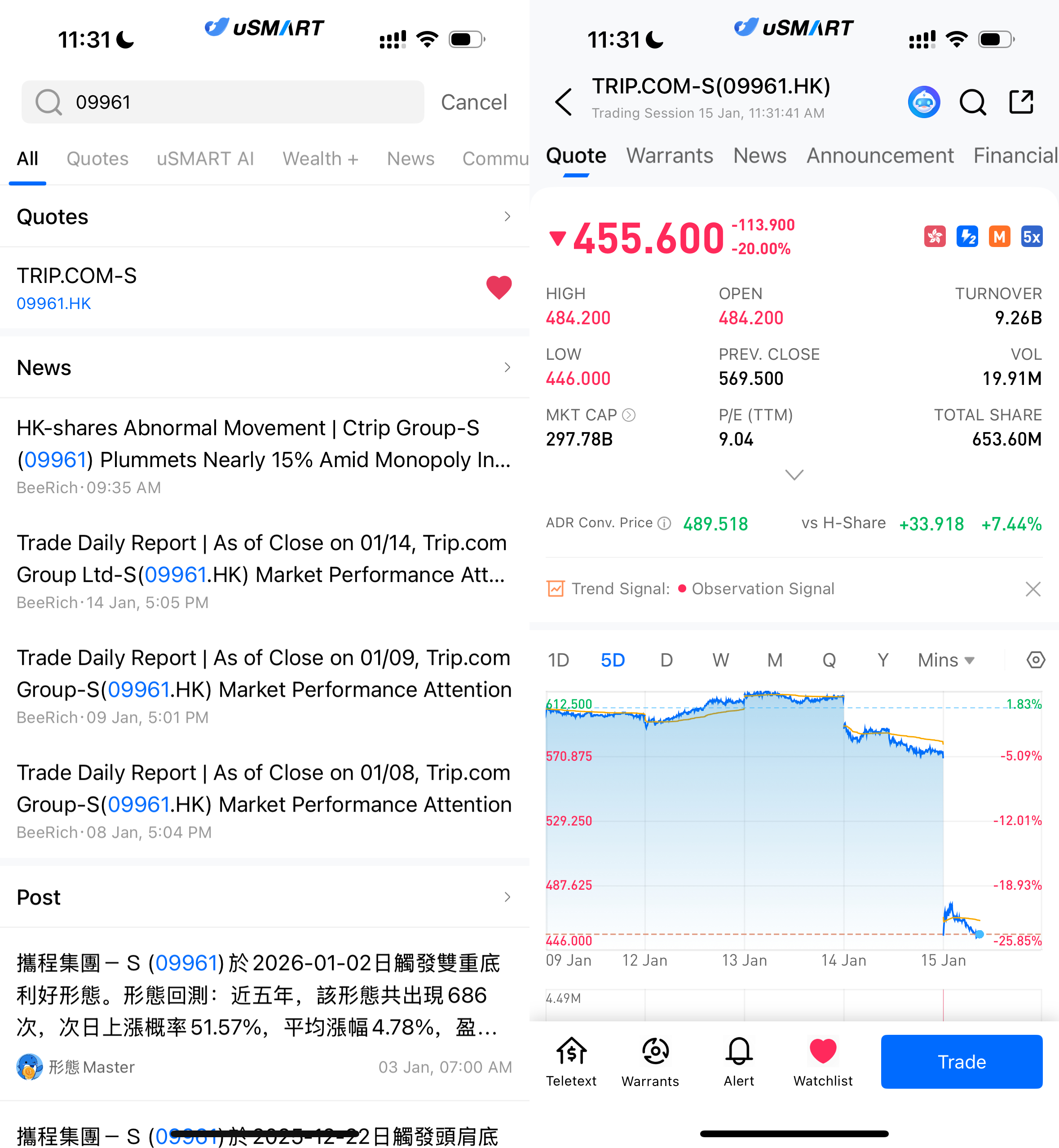 After logging into the uSMART HK app, click the “Search” button in the top-right corner of the page, enter the ticker code (09961.HK), and navigate to the details page to view transaction details and historical trends. Click the “Trade” button in the bottom-right corner, select the trade type, and submit your order after filling in the transaction conditions.