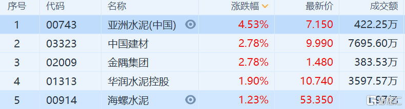 港股异动 | 水泥股普涨 水泥价格稳步上升