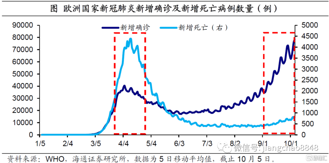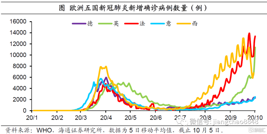 欧洲疫情二次抬头,新增确诊突破峰值。8月以来,欧洲部分国家的新冠肺炎疫情就形成了二次抬头的趋势,而9月这些国家的每日新增确诊病例数量更是突破了前期高点。如英国4月底时上一轮疫情的最高峰,每日新增确诊数量不足5500例,而9月底每日新增确诊病例就超过6000例,105日更是高达近23000例,西班牙和法国也都有类似的情况,分别于8月底和9月初每日新增确诊病例数量突破前一轮疫情顶峰。