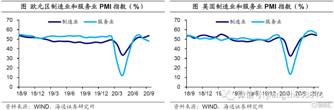 PMI并未失速下滑,多数仍处扩张区间。由于人口流动情况尚未偏离疫情后的常态水平,9月欧元区制造业PMI指数继续上升,创下189月以来新高,服务业PMI指数受疫情影响有所回落,但也远高于二季度初的水平,9月欧元区综合PMI指数仍处扩张区间。而英国9月制造业和服务业PMI指数虽较8月有所下滑,但也尚处于年内高位。