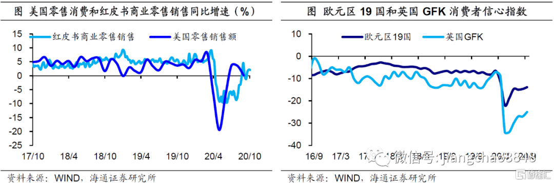 消费恢复有望保持,消费信心继续上升。从消费情况来看,美国红皮书商业零售销售的周度数据显示,9月以来美国消费增速或仍将保持上升势头,明显好于3-5月上一轮疫情严重时期的水平。而欧元区19国消费者信心指数和英国GFK消费者信心指数也都表明,9月消费者信心延续修复势头并未转向,这意味着消费自疫情后的恢复态势或有望保持。