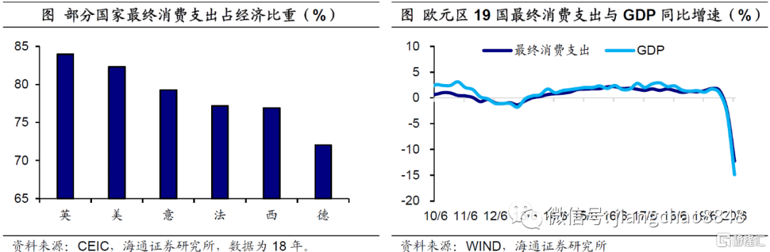 消费地位举足轻重,带动经济延续复苏。对于欧美等发达国家而言,消费在其经济结构中的地位至关重要,如英国最终消费支出占GDP的比重高达84%,美国也有82%的水平,意大利、法国等欧洲国家这一比例也都在70%以上。GDP的七至八成都来自于消费,也就意味着消费增速的变化和GDP增速的变化趋于一致,如果欧美国家消费恢复的态势能够保持,那么,经济复苏的势头大概率也将持续。