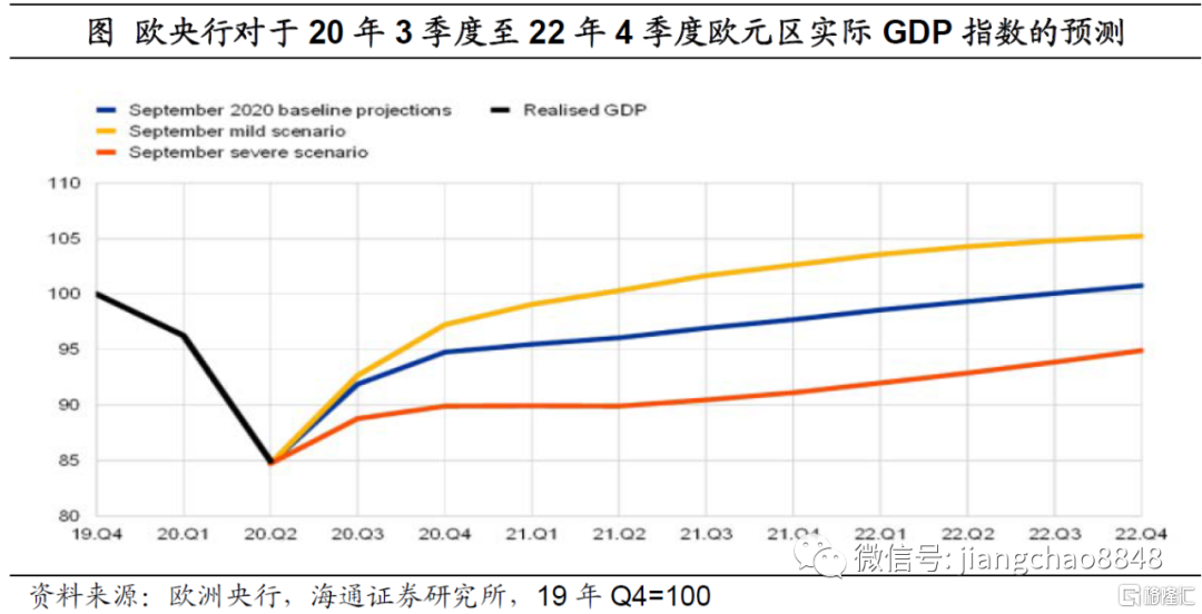 欧洲央行判断类似,经济增长弱势复苏。欧央行对于欧元区经济增长的判断也与此类似。根据欧央行对20年三季度和四季度欧元区经济增长的基准预测,三季度欧元区实际GDP环比增速将由正转负、大幅上升,而四季度GDP环比增速虽可能较三季度有所回落,但仍能维持正增长,不至于陷入衰退区间。从203季度直到22年四季度,欧央行预测欧元区经济能够实现持续复苏,但环比增速逐渐放缓。