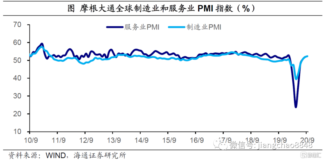进程或将放缓,复苏趋势未变。首先,由于欧美疫情二次爆发并未带来死亡人数的显著上升,因此各国可以尽量避免对于人口流动的全面封锁,各项经济指标也显示,作为全球经济龙头的美国和欧洲,还没有出现因疫情影响而使经济增长重陷全面衰退的迹象。这也意味着全球经济复苏的进程虽然可能有所放缓,但其趋势并未改变,9月摩根大通全球制造业PMI指数继续升至52.3%的高位。