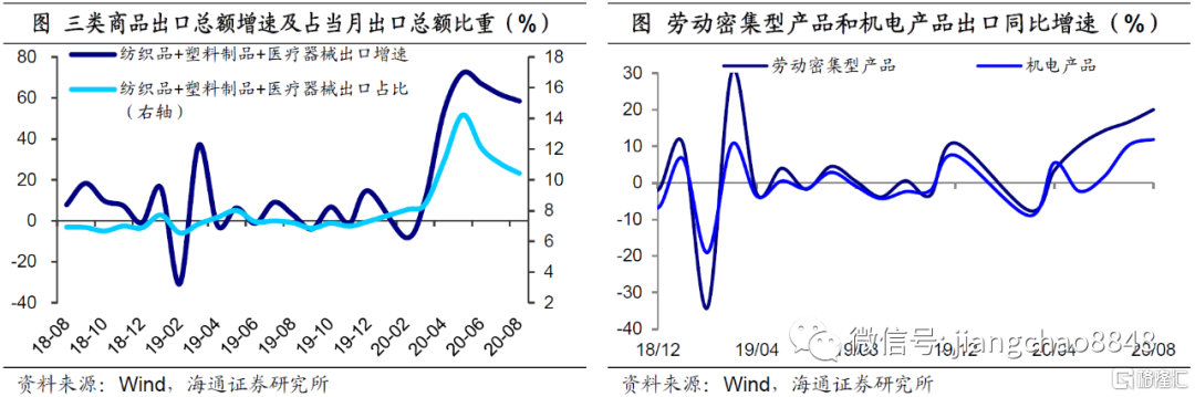 疫情遭遇经济恢复,支撑我国出口韧性。其次,欧美发达国家或将步入疫情上升和经济恢复并存的阶段,而这对于我国的出口很有帮助。一方面,海外疫情上升使得其对我国防疫相关物资的需求仍较旺盛,8月三类防疫物资相关商品合计出口增速仍在58.5%的高位;而另一方面,欧美等国经济的恢复也将支撑我国外需,如作为我国出口中的重要部分,机电产品出口增速已连续两个月位于高位,劳动密集型产品增速也持续回升,包括服装、家具、鞋类等均同步改善。我国出口韧性延续时间或有所延长。
