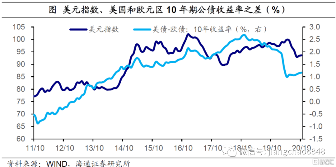 疫情遭遇经济恢复,支撑我国出口韧性。首先,由于欧美疫情二次爆发并未带来死亡人数的显著上升,因此各国可以尽量避免对于人口流动的全面封锁,作为全球经济龙头的美国和欧洲还没有出现因疫情影响而使经济增长重陷全面衰退的迹象。这也意味着全球经济复苏的进程虽然可能有所放缓,但其趋势并未改变。其次,欧美发达国家或将步入疫情上升和经济恢复并存的阶段,而这对于我国的出口很有帮助。一方面,海外疫情上升使得其对我国防疫相关物资的需求仍较旺盛,而另一方面,欧美等国经济的恢复也将支撑我国外需,如作为我国出口中的重要部分,机电产品出口增速已连续两个月位于高位,劳动密集型产品增速也持续回升,我国出口“韧性”延续时间或有所延长。最后,从相对经济表现而言,欧洲还是要弱于美国。在名义经济增长好于欧洲的情况之下,近来美国10年期国债收益率和欧元区10年期公债收益率之差也开始筑底回升,这意味着前期美元指数持续走低的趋势或将有所逆转,虽然上行的进程目前还较平稳,但也给新兴市场国家的货币带来考验。当然,欧美经济复苏的趋势虽然比较明朗,但其进程仍可能受到不确定因素的干扰而并非一帆风顺。美国主要风险来自于总统大选,候选人政策主张对经济影响差异很大,欧洲则取决于英国和欧盟的脱欧协议能否顺利达成。