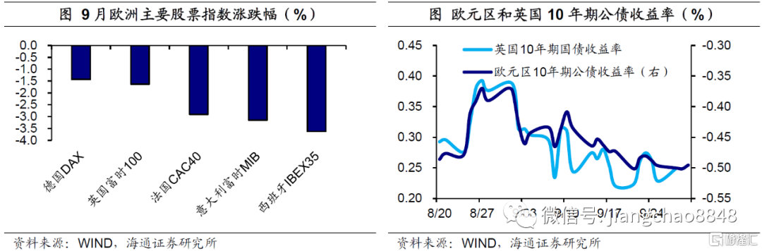担忧疫情风险,9月股跌债涨。欧洲疫情风险的上升在资本市场上同样有所反映,表现为股跌债涨9月德国DAX、英国富时100指数的跌幅分别为-1.4%-1.6%,而法国、意大利和西班牙的主要股指跌幅都在-2.5%以上,相对应地,9月底欧元区和英国的10年期公债收益率分别较8月底下降12BP10BP