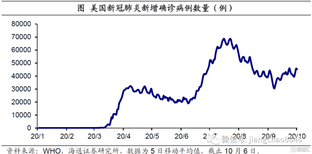 美国疫情见底回升,重回8月中旬水平。与此同时,美国的疫情也有再度见底回升的趋势。按照5日移动平均法来计算,105日美国每日新增确诊病例数量超过45600例,远高于9月中旬30000例左右的低点,回到了接近于8月中旬的水平,而7月底8月初正是美国第二波疫情的高峰。