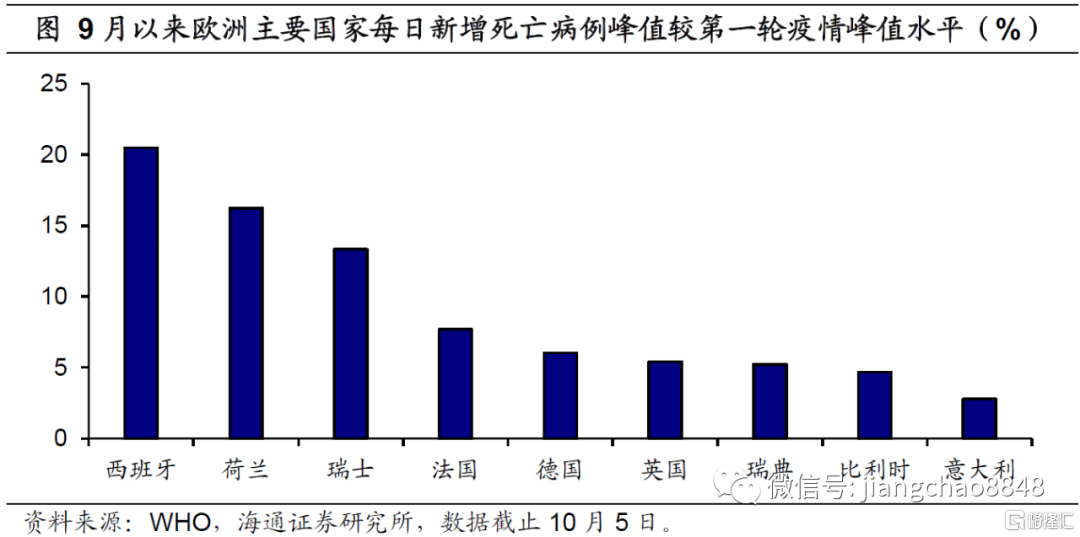 确诊远超前期峰值,死亡仅有五分之一。如疫情二次爆发态势较为严峻的西班牙,9月以来其每日新增新冠肺炎确诊病例数量的峰值大约是第一轮疫情时的1.8倍,但新增死亡病例数量的峰值却仅有第一轮疫情时峰值的20%左右,这在欧洲国家之中还算相当高的水平,每日新增确诊病例同样突破前期顶峰的法国和英国,其每日新增死亡病例数量的峰值分别只有第一轮疫情时的7.7%5.4%