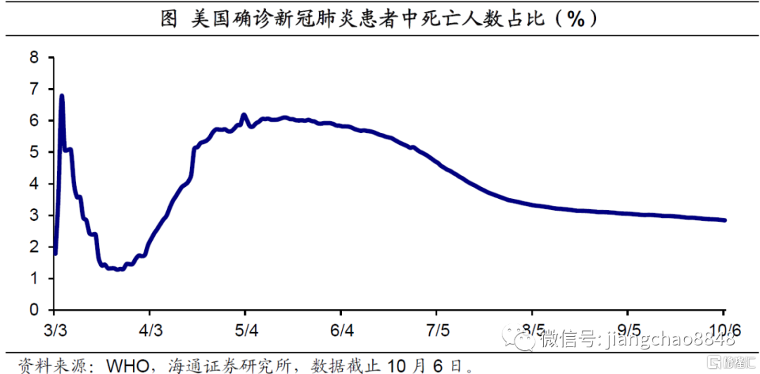死亡占比持续回落,不及前次高峰一半。美国的情况也同欧洲类似,从死亡率上来看,截止106日,美国所有确诊新冠肺炎的患者之中,累计死亡人数占比已降至2.84%,远低于疫情在美国刚开始爆发时的瞬时高点6.77%,也不足第一轮疫情高峰时顶部值6.18%的一半。因新冠肺炎而死亡的患者比例持续减少,意味着应对疫情的医疗手段取得了一定的效果。
