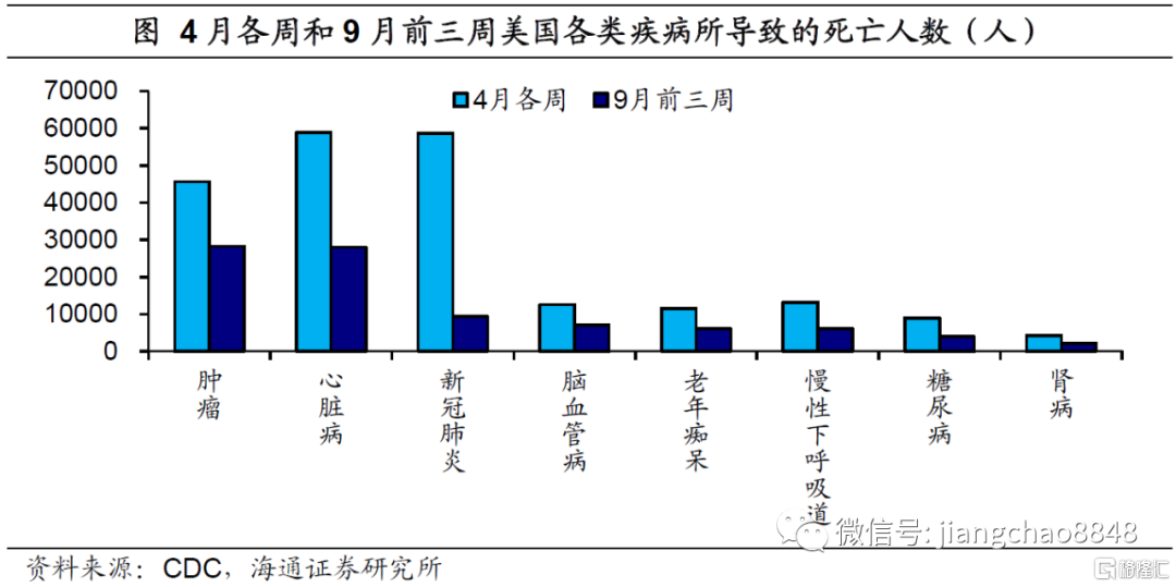 致死病因排名下滑,新冠不敌恶性肿瘤。由于新冠肺炎患者常会伴有其它的慢性疾病,根据美国疾控中心所统计的死亡病因,当前的情况也完全不同于第一轮疫情高峰。4月各周美国因新冠肺炎致死的人数与因心脏病致死的人数几乎不相上下,位于各项致死病因的前两位,而9月前三周因恶性肿瘤致死人数同因心脏病致死人数旗鼓相当,位列各项致死病因之首,但因新冠肺炎致死人数已明显下降,仅是因心脏病致死人数的三分之一左右。