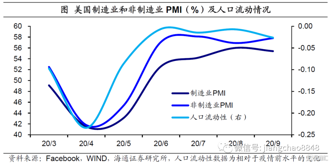 复苏依赖人口流动,美国PMI仍在线上。事实上,疫情期间对于人员流动的封锁,是造成经济活动陷入停滞的主要原因,而人口流动性一旦恢复,经济自然也就随之复苏。从美国的情况来看,在封锁最为严重的4月,其制造业PMI和非制造业PMI双双下滑至不足42%,创下2010年以来的新低,而后随着人口流动性见底回升,两者在6月又都重新回到扩张区间。9月美国制造业PMI8月略有回落,但仍处于年内高位,且超过7月水平,非制造业PMI更是小幅上行,并没有看到因疫情影响而使经济增长重陷衰退的迹象。