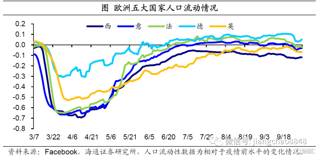 全面封锁尽量避免,欧洲五国流动如常。而从社交网络大数据所提供的信息来看,西班牙、意大利、法国、德国和英国五大欧洲主要国家,即便疫情日趋严峻,但9月以来乃至10月初整体的人口流动性并没有出现较大幅度的萎缩,远好于上一轮疫情顶峰。正如前文所述,由于第二轮疫情爆发并没有使得死亡病例同步走高,死亡患者比例依然趋于下降,因此,虽然不排除个别地区封锁措施的再度出台,但二次爆发疫情国家全面封锁的必要性不强,各国出于经济增长考虑也会尽量避免,这意味着二次疫情对于经济复苏进程的干扰或许有限。
