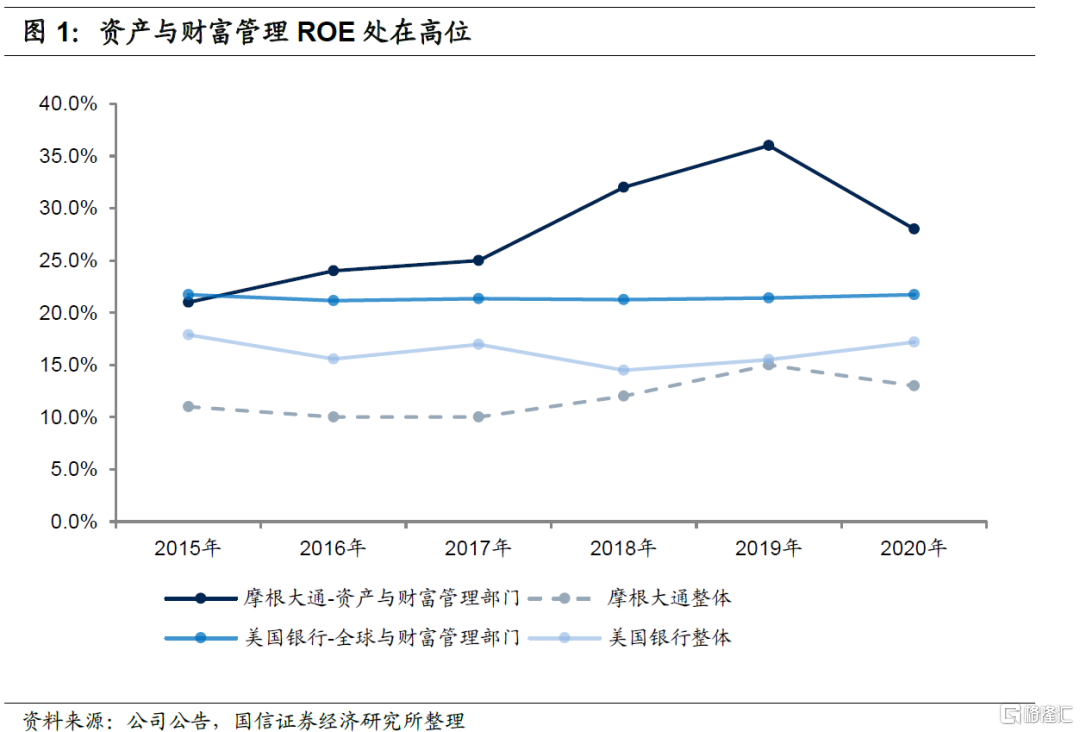 摩根大通财富管理业务在行业中处于领先地位,资产与财富管理部门ROE在四大业务板块中持续处在最高水平。2020年末摩根大通资产与财富管理板块下客户总资产合计为3.65万亿美元,其中AUM为2.72万亿美元,经纪资产等(Custody/brokerage/administration/deposits)为0.94万亿美元,公司以主动管理产品体系为主。2020年资产与财富管理部门实现收入142.4亿美元,净利润29.9亿美元,分别占摩根大通总收入和净利润的11.6%和10.3%。资产与财富管理板块ROE近年来持续高于其他三大业务板块,2020年资产与财富管理板块ROE为28%,公司整体ROE为12%。