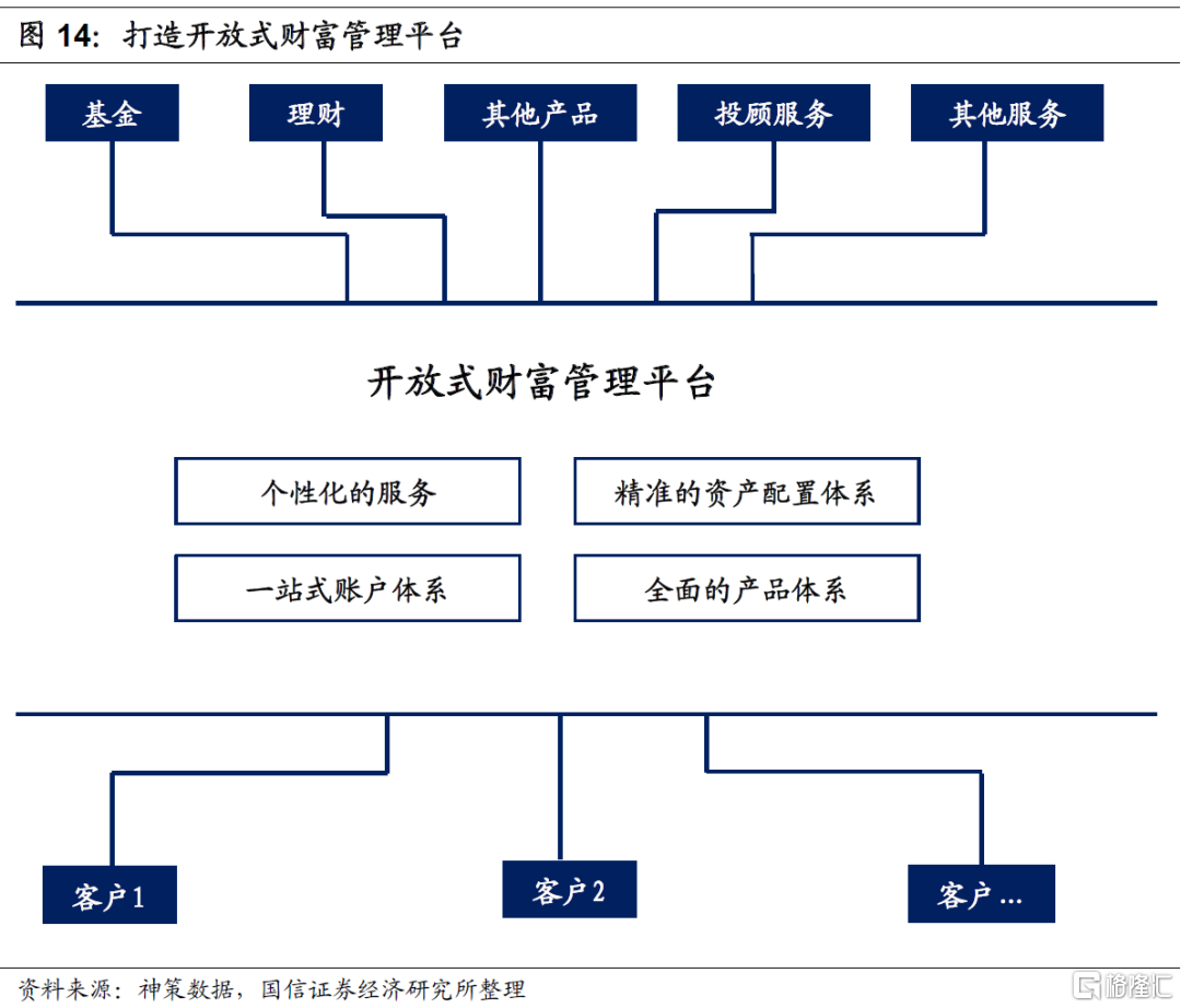打造开放式的财富管理生态圈,提供一站式综合化服务。美国商业银行财富管理业务早已不是简单的卖自家产品,而是协同集团内多个金融牌照的优势,联结外部机构打造开放式的产品货架和财富管理生态圈,为客户提供一站式的综合化服务,既包括个性化的金融服务,也包括多种生活服务。打造开放式产品货架对产品筛选能力和资产配置能力等提出了更高的需求,这是未来财富管理机构需要面临的挑战。未来财富管理机构不仅需要加强与外部金融机构合作,还需要与非金融机构合作,共同打造开放的财富管理生态圈。
