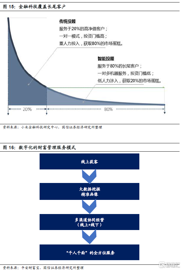 随着数字化时代的到来,金融科技发展迅速,数字化转型成为未来财富管理机构决胜的关键因素之一。财富管理数字化一方面延伸了财富管理客群边界,进一步打开了成长空间;另一方面改变了财富管理服务模式,助力实现“千人千面”的全方位服务,满足客户个性化需求。传统的财富管理对专业的财富顾问依赖度非常大,因此一般只有富裕及高净值客群才可以享受到财富管理服务,但金融科技使得普通大众也能享受到财富管理服务。同时,财富管理机构还可以通过大数据挖掘来对客户精准画像,以实现精准营销,提供“千人千面”的个性化产品和服务,降低交易成本、升级风险管理系统等目标。近年来以摩根大通、富国银行代表的美国商业银行以及以招商银行和工商银行为代表的我国商业银行均是加大了金融科技的投入。