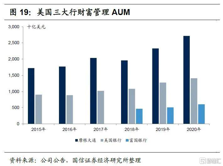 财富管理业务,特别是私人银行,对商业银行财富管理品牌口碑与客户积累需求较高,因此大型商业银行在财富管理业务上具有一定的优势。由于花旗集团将财富管理业务融合在全球消费者银行板块,并未单独披露财富管理经营数据,因此我们主要分析摩根大通、美国银行和富国银行财富管理业务。在详细解析三大行财富管理业务之前,我们首先对三大行财富管理规模、财富管理板块对公司业绩贡献等数据做一个比较,以简单了解三大行财富管理业务发展态势。