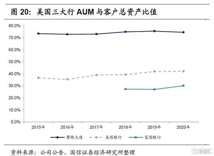 摩根大通AUM和客户总资产规模最大,产品体系以主动管理投资组合为主,资产配置能力是其核心优势之一。富国银行经纪资产比重较大,营销能力是其核心优势之一。美国银行产品结构则相对均衡,近年来主动管理产品比重处于提升通道。2020年末摩根大通、美国银行和富国银行财富管理部门客户总资产分别是3.65万亿美元、3.35万亿美元和2.01万亿美元,其中AUM分别是2.72万亿美元、1.41万美元和0.60万亿美元,AUM占客户总资产的比重分别是74.4%、42.0%和30.1%。