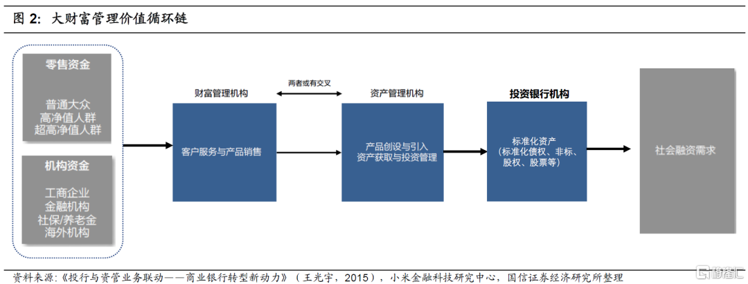 国内银行业也日益重视财富管理业务。招商银行在2020年报中提出“大财富管理价值循环链”概念,业务经营从银行资产负债表转向客户总资产负债表,形成“财富管理-资产管理-投资银行”的价值循环链。近年来我国居民可投资资产规模持续增长,同时伴随着刚兑打破和长期利率的趋势性下行,居民财富管理需求日益旺盛。另一方面,我国经济结构和资本市场融资结构转型,企业多元化融资需求增加,大财富管理价值循环链则很好链接了居民资金供给端和企业融资需求端。如:投行业务为某新动能企业提供并购贷款,获得优质非标资产,经由资管部门组合打包成私募基金,再由零售条线销售给私行客户,一笔业务就从B端串联到C端。若私行客户是企业主,自身也有融资和工资代发需求,又可发起一轮新循环。
