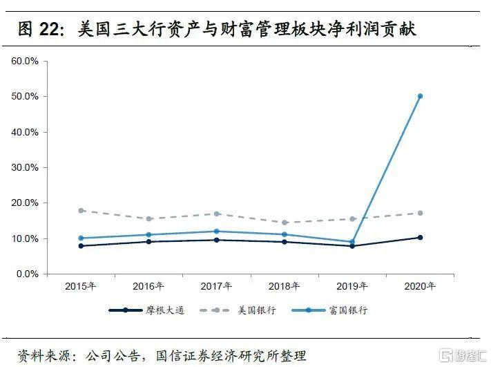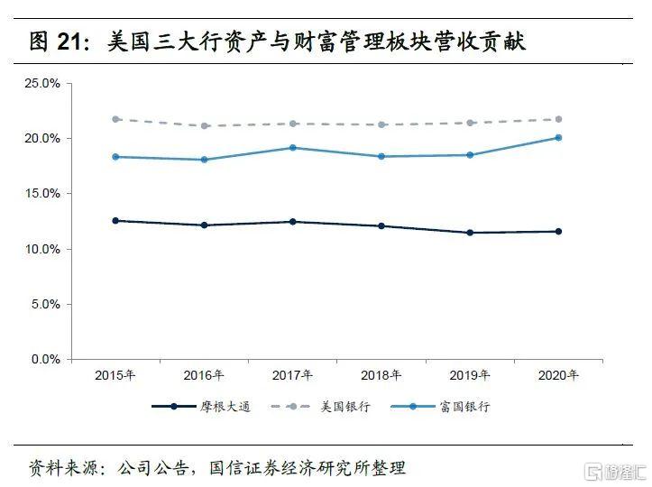 美国银行资产与财富管理板块对公司业绩贡献最高,摩根大通最低。2020年疫情对银行业绩冲击较大,因此我们主要看2019年美国三大行资产与财富管理板块业绩对公司的贡献度。2019年摩根大通、美国银行和富国银行资产与财富管理板块对公司收入的贡献分别是11.5%、21.4%和18.5%,对公司净利润的贡献分别是7.9%、15.5%和9.0%。整体来看,三大行财富管理业务对公司业绩直接贡献都不是太大,但财富管理业务重要性更多来自于直接收益贡献之外的维系客户、提供综合金融服务,与投行等其他业务板块协同发展等带来的间接收益。