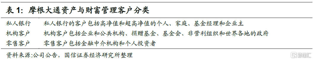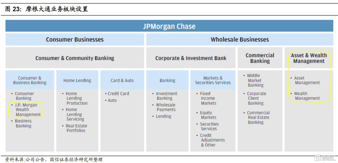 摩根大通财富管理业务主要包括:资产与财富管理板块(AWM)下的资产管理、财富管理以及消费者与社区银行板块(CCB)下的摩根大通财富管理(J.P Morgan Wealth Management)。其中,资产管理为机构客户和零售客户提供多元化资产投资管理解决方案,涵盖股票、固定收益、另类投资和货币市场基金等多元化产品,以实现满足客户广泛的投资需求。财富管理为高净值客户提供退休产品和服务、经纪、托管、信托和遗产、贷款、抵押、存款和投资管理等服务。消费者与社区银行板块下的摩根大通财富管理为非高净值客户提供财富管理服务。