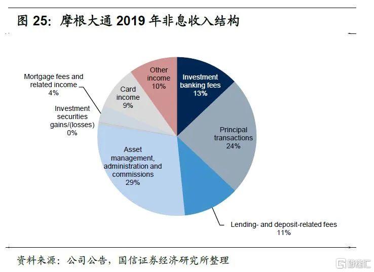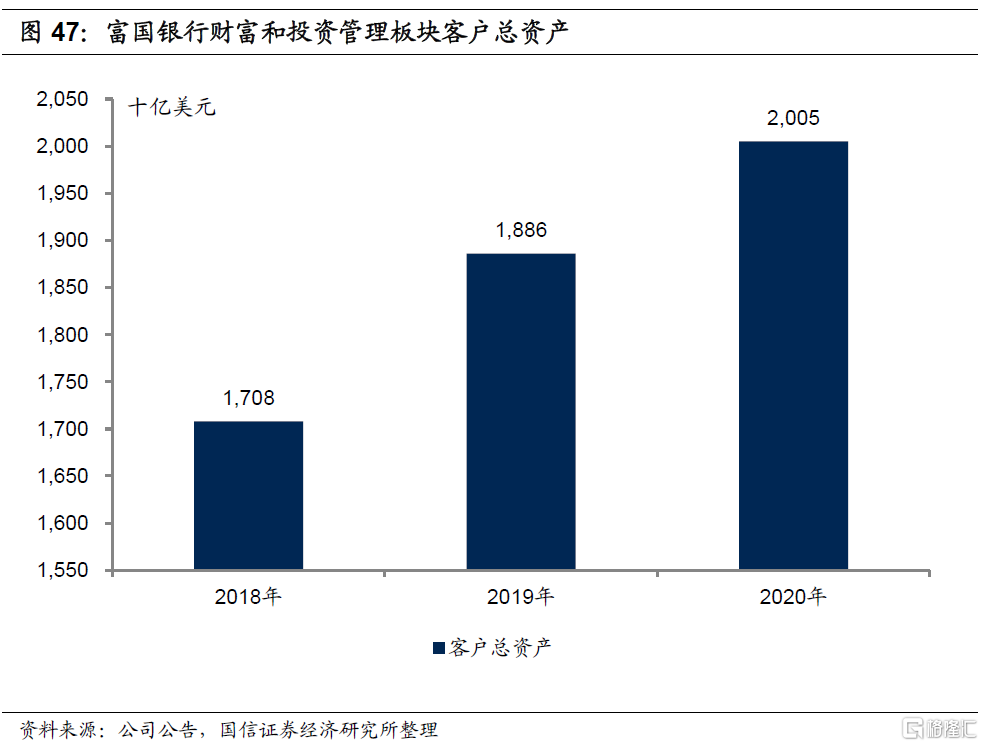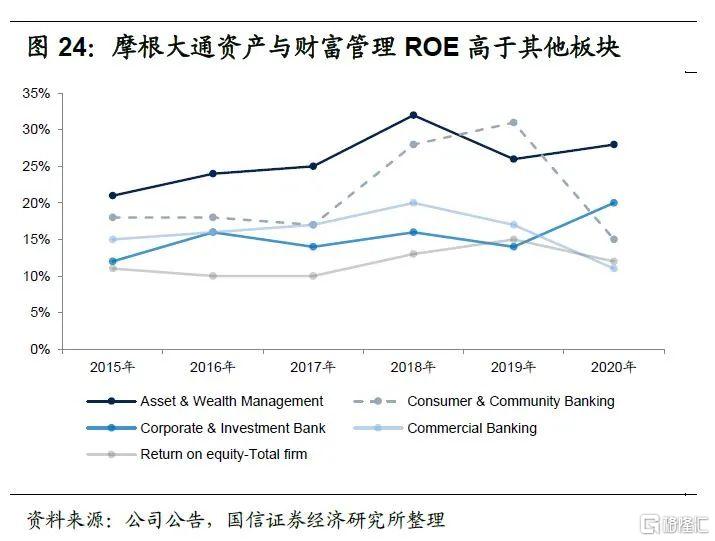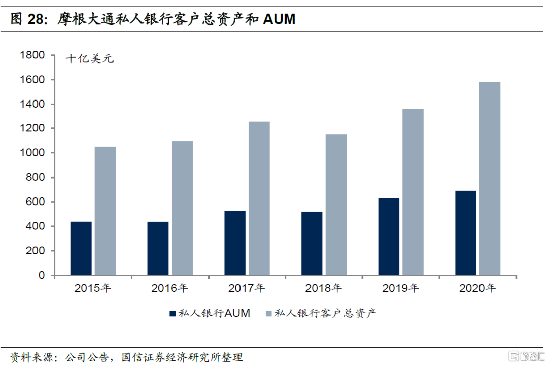 由于摩根大通将部分非高净值客户财富管理业务放在消费者与社区银行板块下的摩根大通财富管理条线,因此财富与资产管理板块业绩实质上低估了财富管理业务对公司的贡献。2020年摩根大通整体资产管理手续费及佣金(Asset management, administration and commissions)收入为182亿美元,明显高于财富与资产管理板中的资产管理手续费及佣金收入106亿美元。近年来摩根大通非息收入占总收入比重约为50%,其中非息收入中资产管理手续费及佣金收入比重约为30%,财富管理是公司非息收入的重要来源。