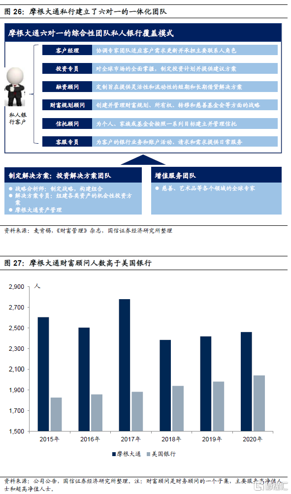 摩根大通非常重视私人银行业务,为了更好的服务私人银行客户,公司前期建立了六对一的私人银行一体化团队覆盖模式,为每个客户配备了专门的客户经理、投资顾问、融资顾问、财富规划顾问、信托顾问和日常服务专员。在摩根大通一体化团队服务模式中,私人银行团队的前中后台每个成员都可以和客户直接见面咨询,每次互动结果都需在团队内分享。这与传统的私人银行模式中只有客户经理和客户面对面交流相相比较,摩根大通一体化团队服务模式能更好的了解客户的需求,提供符合客户需求的产品和服务,增强与客户的黏性。同时,除了六对一的团队之外,摩根大通还配有额外的投资解决方案团队和增值服务团队,以更好地服务超高净值客户的多元化、定制化需求。摩根大通服务高净值客户的财富顾问人数明显多于美国银行,2020年末摩根大通财富顾问人数为2462人,占财富与资产管理板块员工数量的11.9%,美国银行财富顾问人数为2042人,占全球财富与投资管理部门员工数量的9.6%。