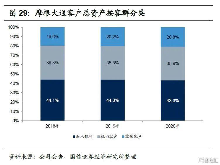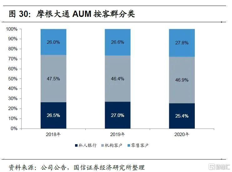 2020年末摩根大通私人银行客户总资产1.58万亿美元,管理的私人银行AUM为0.69万亿美元。客户总资产结构来看,2020年末私人银行客户资产比重为43.3%,机构客户资产比重为35.9%,零售客户资产比重为20.8%,私人银行客户贡献最大。AUM结构来看,私人银行AUM比重为25.4%,机构客户AUM比重为46.9%,零售客户AUM比重为27.8%,机构客户贡献最大。