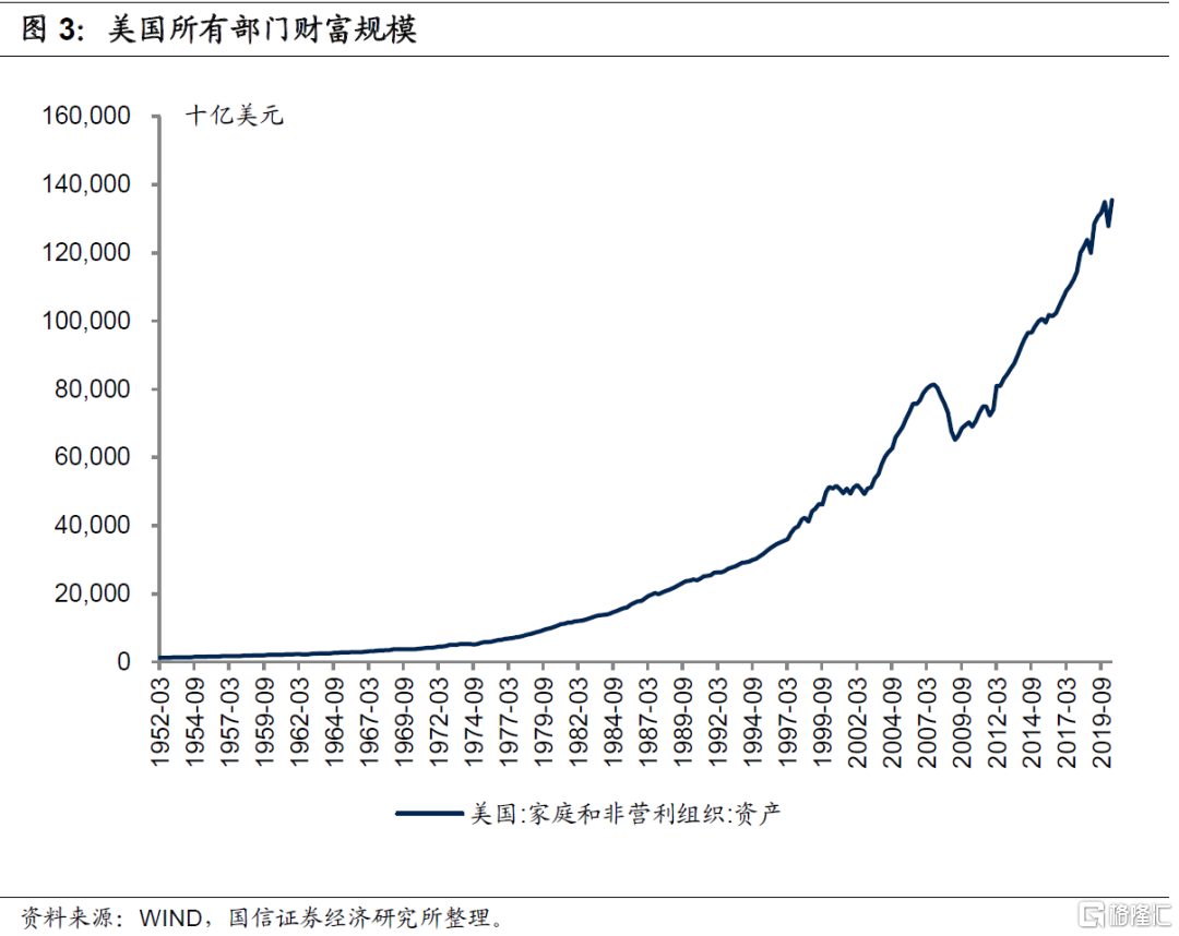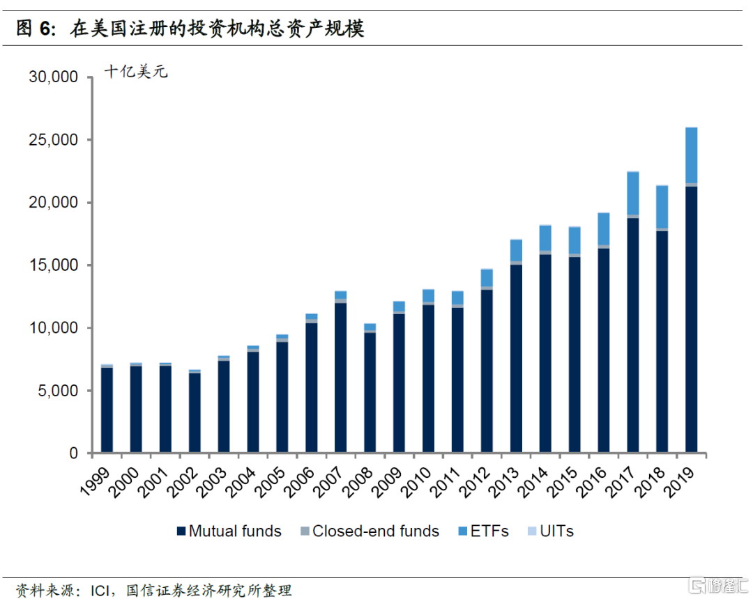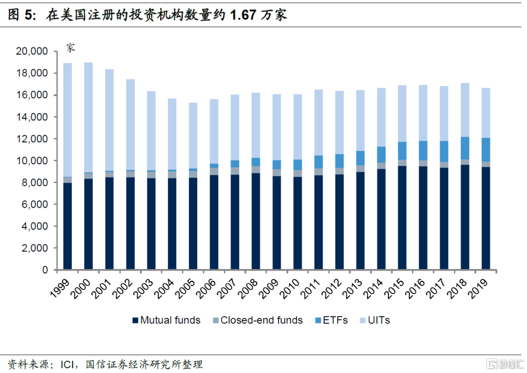 受益于庞大的家庭资产和旺盛的财富管理需求,美国财富管理市场规模庞大且保持了较好增长。根据美国投资协会(ICI)统计,在美国注册的投资机构虽不断的退出和进入,但投资机构总数持续保持在一个较高的水平。各类型机构数量变动有所差别,如近年来ETF投资机构数量持续增加,从1999年的30家增长到2019年底的2157家,单位投资信托机构则由1999年的10414家下降到2019年底的4571家。2019年末在美国注册的投资机构净资产规模达到26.04万亿美元,较1999年增长了266%,1999-2019年年均复合增速为6.7%,保持了较好增长。