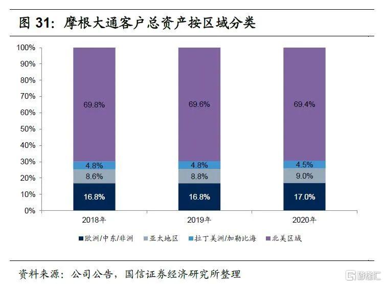 摩根大通财富管理业务遍及全球,但北美市场是其主战场。近年来北美区域客户资产比重和AUM比重基本稳定在70%。2020年末客户总资产区域结构,北美区域占69.4%,欧洲/中东/非洲占17.0%,亚太地区占9.0%,拉丁美洲/加勒比海只能4.5。AUM区域结构,北美区域占70.1%,欧洲/中东/非洲占19.0%,亚太地区占8.2%,拉丁美洲/加勒比海只能2.6%