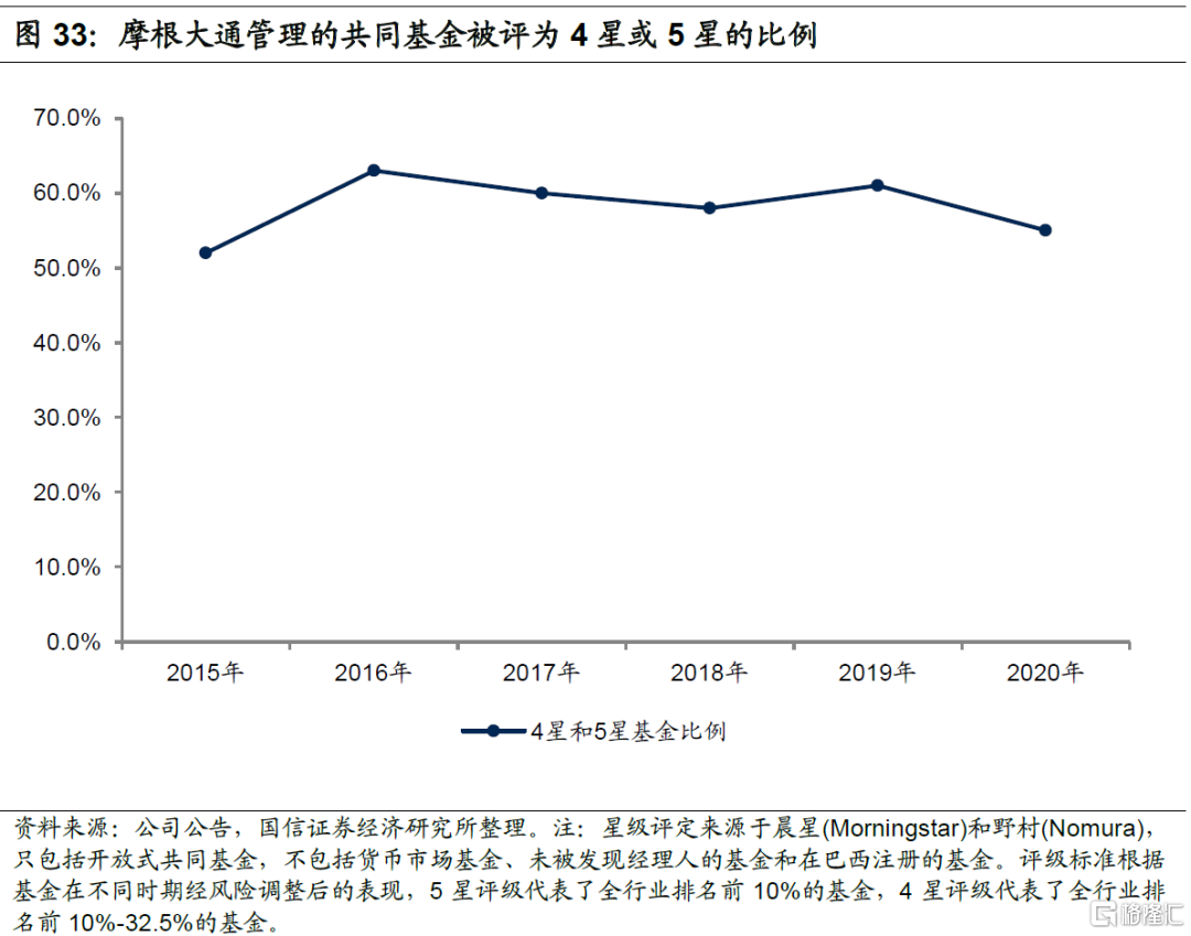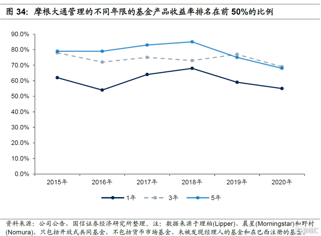 指标2:所管理的基金收益率排名在前50%的百分比,摩根大通该比例长期在50%以上,且持有时间越长收益率越高,表明长期投资能力优秀。截止2019年末,摩根大通管理了一年、三年和五年的基金收益率排名在前50%的比例分别是59%、77%和75%,2020年上述比例分别下降到55%、69%和68%,但仍处在高位。