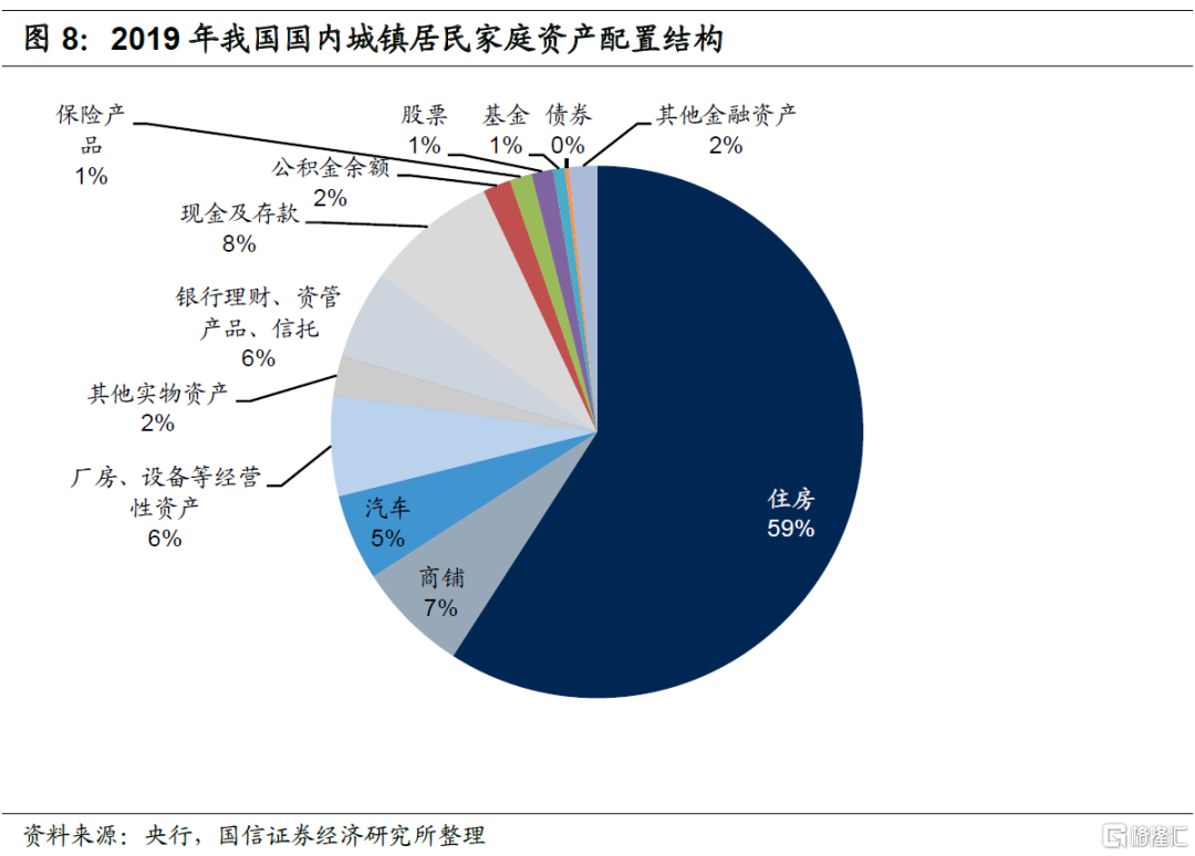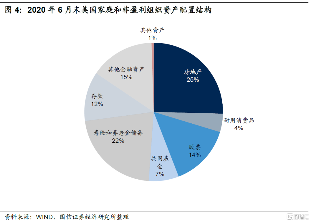 美国家庭资产庞大,金融资产配置占七成且股票基金和保险资产配置比例较高,房地产配置不到三成,明显低于我国居民房地产配置比例。2020年6月末美国家庭和非盈利组织总资产达到135万亿美元,资产结构为房地产配置比例25.4%,金融资产配置比例69.8%。金融资产中,股票和共同基金比例21.4%、保险和养老金比例21.7%、存款比例11.6%、其他金融资产比例15.1%。因此相比于房地产,美国居民更倾向于将资产配置于金融资产之中,而且更倾向于配置股票基金、保险和养老金等资产。