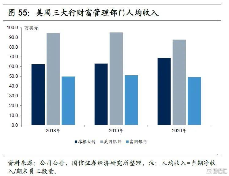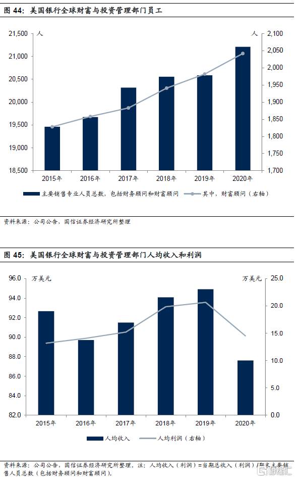 美国银行财富管理业务人才队伍持续扩大,2020年末公司主要销售专业人员(包括财务顾问和财富顾问)达到2.12万人,其中财富顾问人数为2042人。2019年美国银行全球财富与投资管理部门员工人均收入和人均利润分别是94.9万美元和20.6万美元,2020年略有下降但仍在高位。