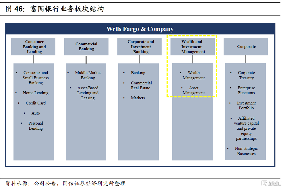 2020年富国银行将三个业务部门重新拆分为五个部门,分别为消费者贷款部门、商业银行部门、公司银行和投资银行部门、财富和投资管理部门、公司部门。财富和投资管理(WIM)板块提供全面的财富管理、投资管理与养老产品和服务,公司还满足客户的经纪业务需求,并为高净值客户和超高净值客户提供财务计划、私人银行业务、信贷和信托服务等。据路透社2020年末报道,富国银行正考虑出售资产管理业务,2020年末富国银行的资产管理部门为客户管理6030亿美元的资产,未来是否剥离资产尚不确定。