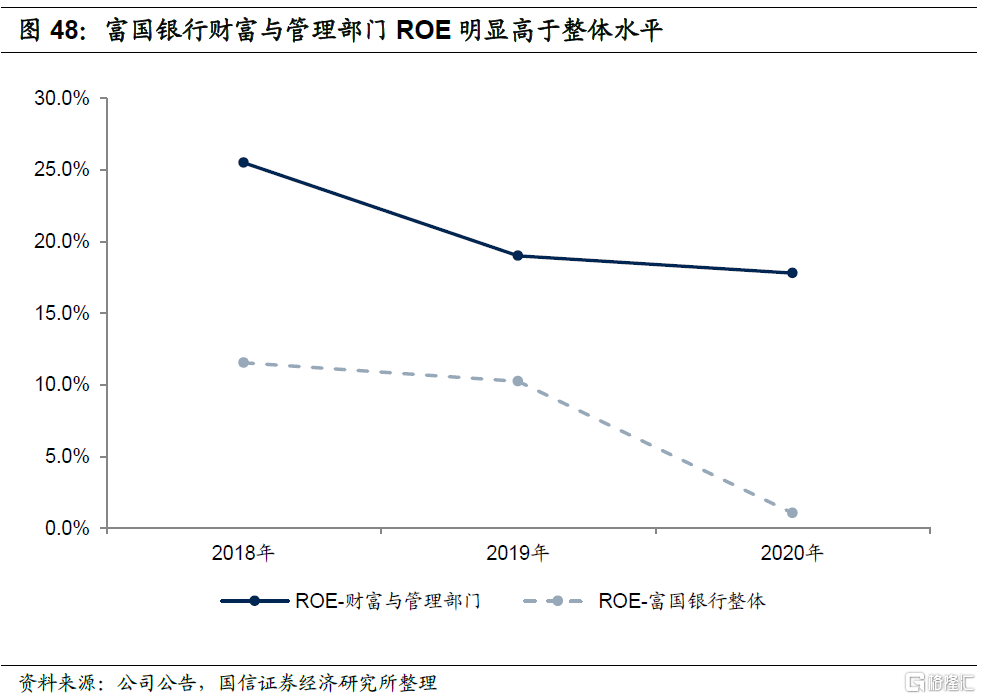 海外银行经营数据也证明了财富管理业务是一项利润率高、资本占用低、稳定性强、护城河高的业务,摩根大通和美国银行财富管理板块ROE长期以来明显高于公司整体ROE水平,且财富管理业务与投行业务等其他业务板块协同发展,给公司带来了非常大的综合收益。