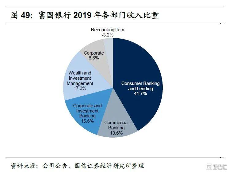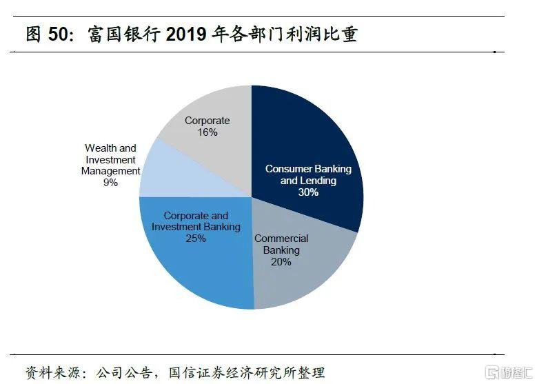 2020年末富国银行财富和管理部门客户总资产达2.0万亿美元,较2018年末增长了17.4%,维持了较好的增长。2020年财富和管理部门实现收入145亿美元,实现净利润16.6亿美元,较2019年有所下降,主要是降息使得净利息收入有所下降以及计提的贷款损失准备有所增加。公司财富与投资管理板块ROE明显持续高于公司整体ROE水平,由于疫情冲击下富国银行2020年净利润同比下降了83%,因此我们分析2019年各部门收入比重,2019年财富和投资管理收入贡献为18.5%,利润贡献为9.0%。