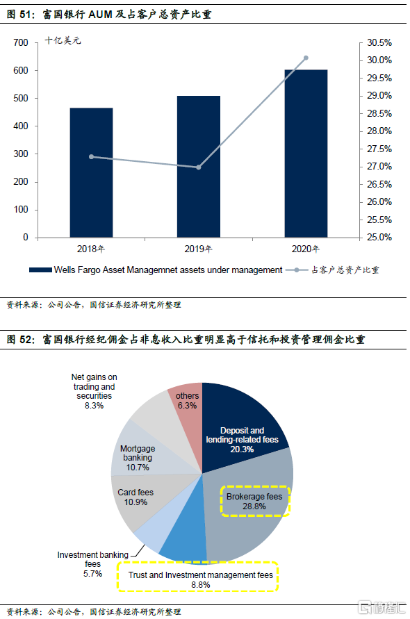 公司Wells Fargo Asset Management管理的AUM占财富和投资管理板块客户总资产的比重不到30%,明显低于摩根大通,也低于美国银行。从非息收入贡献来看,富国银行经纪业务佣金收入占非息收入比重为28.8%,信托和投资管理手续费非占非息收入比重仅8.8%。我们认为这与富国银行服务客群的定位和其核心竞争优势相关,富国银行作为一家从社区银行发展起来的大型商业银行,专注于服务中小企业客户和个人客户,大众和富裕客群数量庞大。同时,假账户事件之前交叉销售是富国银行的核心竞争优势,公司营销能力非常强,2015年其零售银行客户平均有6.11个富国银行的产品,批发银行客户平均有7.3个,WBR的零售客户平均有10.55个产品。