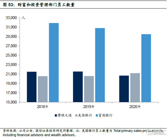 富国银行财富管理部门依靠其庞大的人才队伍以及广泛的营业网点来拓展财富管理业务,营销能力是公司核心优势之一。富国银行财富管理部门客户资产规模低于摩根大通和美国银行,但财富管理部门员工要远超摩根摩根大通和美国银行。2020年末富国银行、摩根大通和美国银行财富管理部门员工分别为2.95万人、2.01万人和2.12万人。