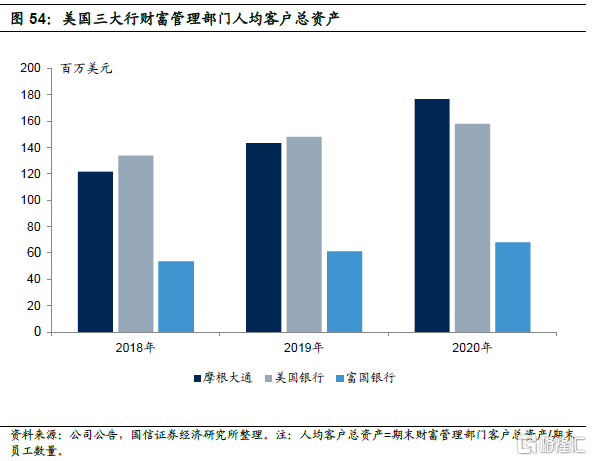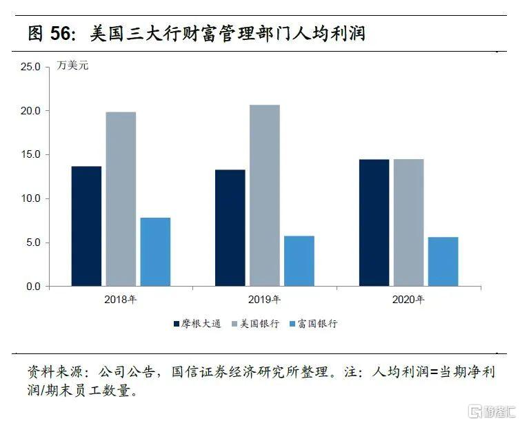 富国银行财富管理部门人均产能低于摩根大通和美国银行。由于公司大众和富裕客群数量庞大,零售客户经纪资产规模较大,因此公司人均产能明显低于摩根大通和美国银行。2020年末富国银行、摩根大通和美国银行财富管理部门员工人均管理客户总资产分别为68百万、177百万美元和158百万美元,2020年人均收入分别是、49.2万美元68.8万美元和87.6万美元,人均利润分别是5.6万美元、14.5万美元和14.5万美元。
