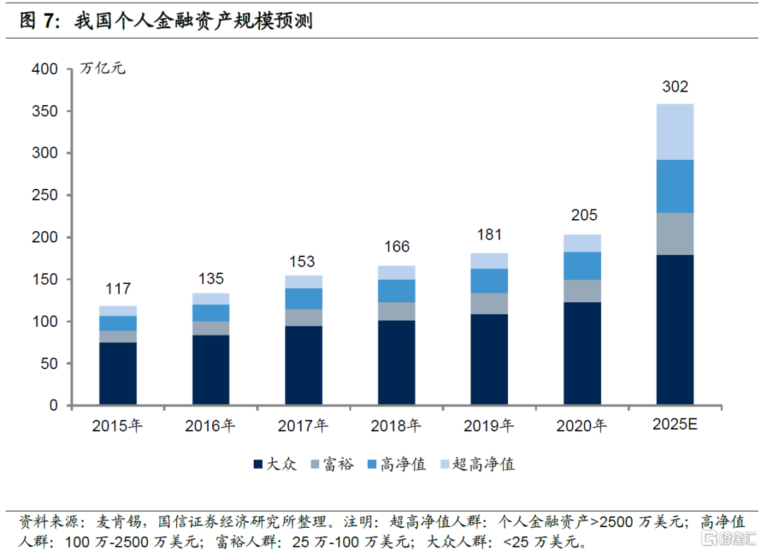我国居民家庭资产配置住房比例接近60%,金融资产也以保本型产品为主,其中,现金和存款配置比例8.0%、银行理财及资管产品和信托配置比例5.4%、股票和基金配置比例仅2.0%。随着居民收入增长、利率市场化改革深化、刚性兑付打破等,我国居民财富管理意识逐渐增强。我们认为未来我国财富管理业务空间巨大,一方面,当前我国经济增长在全球主要经济体中处在较高水平,预计居民财富规模增速也将实现较快增长。麦肯锡预测2025年我国个人金融资产将达到332万亿元,2021-2025年年均复合增速为10.1%,且超高净值和高净值客户金融资产更快。另一方面随着居民资产配置结构的调整,预计我国居民将降低房地产资产配置增加金融资产配置,未来居民财富管理需求将大幅增加。