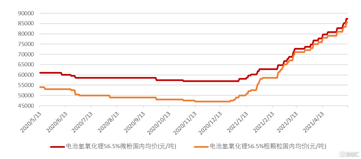 从上述数据可以看出氢氧化锂涨幅最为明显,显然除了流动性过剩原因,氢氧化锂还有供求方面的原因。