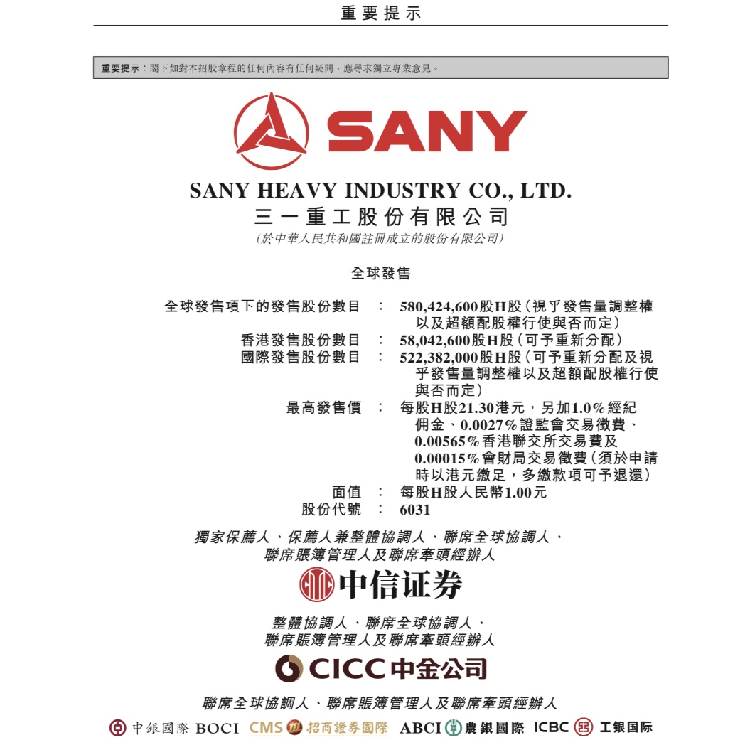 SANY Heavy Industry Co., Ltd. (Stock Code: 06031.HK) has launched its Hong Kong IPO. The subscription period runs from October 20 to October 23. The company plans to globally issue 580,424,600 H-shares, with an over-allotment option. The offer price is set between HK$20.30 and HK$21.30 per share, with a board lot of 200 shares, and an initial investment requirement of approximately HK$4,302.97. The shares are expected to commence trading on the Main Board of the Stock Exchange on October 28. CITIC Securities is the sole sponsor.